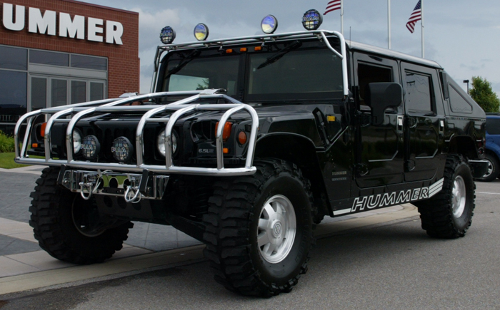 '00 HUMMER H1 Slant-Back 26,xxx mi. Turbo Diesel, Deluxe Tan Leather interior, Monsoon Stereo with CD Changer, Central tire inflation, Cruise, A/C, Driveline protection, Custom Chrome Stinger Brushguard, Custom Chrome Light Bar with PIAA Lamps, Trailer towing package, Power mirrors, Power windows, keyless entry, Rocker panel protection, Heated Windshield, Alloy Wheels,. Black. P1039